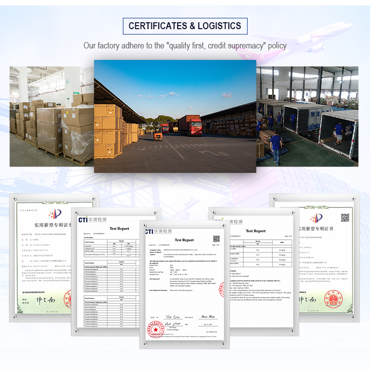 Dajiang Factory for 17 years 1 ISO9001 ISO14001 certified, 7S factory management, 2 products rohs reach certified 3 Project experience with Sony, Samsung,Dell etc enterprise 4 plug and cable sell to England ,Germany,USA,Japan 75 countries
