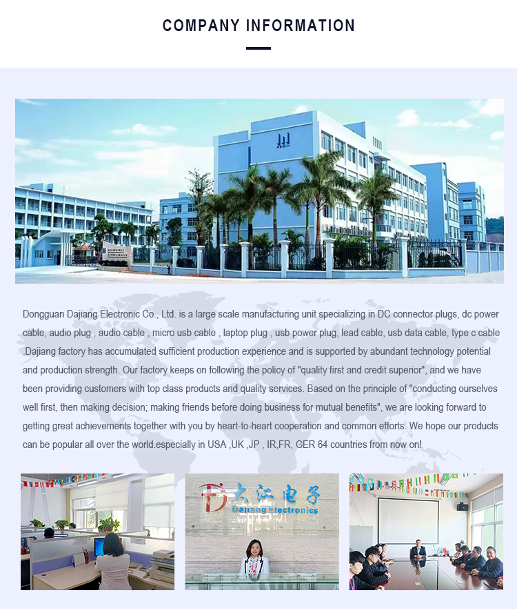 Dongguan Dajiang Electronic Co., Ltd. is a large scale manufacturing unit specializing in DC connecting plugs, dc power cable, audio plug , audio cable , micro usb cable , laptop plug , usb power plug, lead cable, usb data cable, type c cable Dajiang factory has accumulated sufficient production experience and is supported by abundant technology potential and production strength. Our factory keeps on following the policy of "quality first and credit superior", and we have been providing customers with top class products and quality services. Based on the principle of "conducting ourselves well first, then making decision; making friends before doing business for mutual benefits", we are looking forward to getting great achievements together with you by heart-to-heart cooperation and common efforts. We hope our products can be popular all over the world.especialy in USA ,UK ,JP , IR,FR, GER 64 countries from now on!