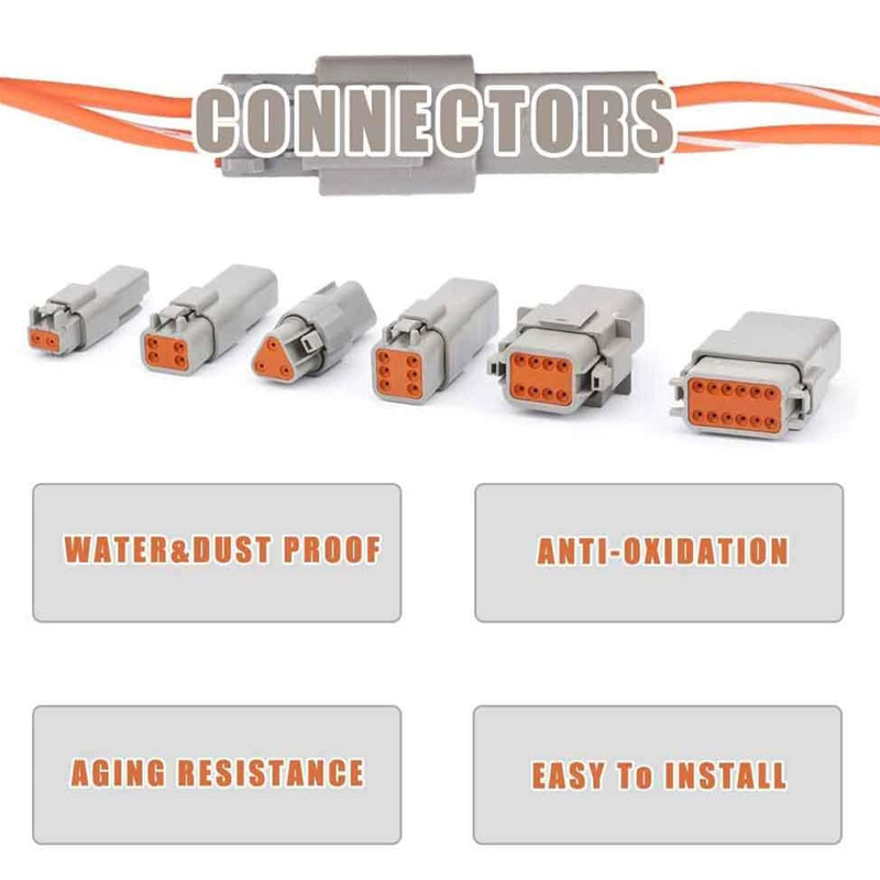 Connector Material:PA66 nylon,durable and waterpoof,convenient to connect and disconnect,suitable for long time use. High Precision Contact:The terminals have strong stability and conductivity,easy to crimping with wire and installing into connector Wide Application:The strong stability allows them to be widely used in car,motorcycle,truck,boats etc